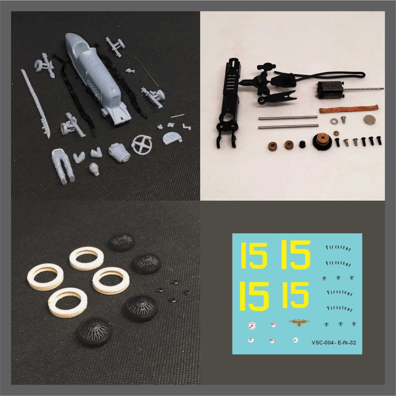 KIT 1/32 COMPLETO – SIN PINTAR – INCLUYE FIGURA DEL PILOTO Y CALCAS – CHASIS Y MICROMOTOR 6-12V DE 20.000 RPM REALIZADO EN RESINA DE ALTA DENSIDAD, APTA PARA GOLPES Y CAÍDAS Y CON EXCELENTE PROPIEDADES DE TORSIÓN. RUEDAS DE ALAMBRE DE 3 PARTES, INYECTADAS EN PP
