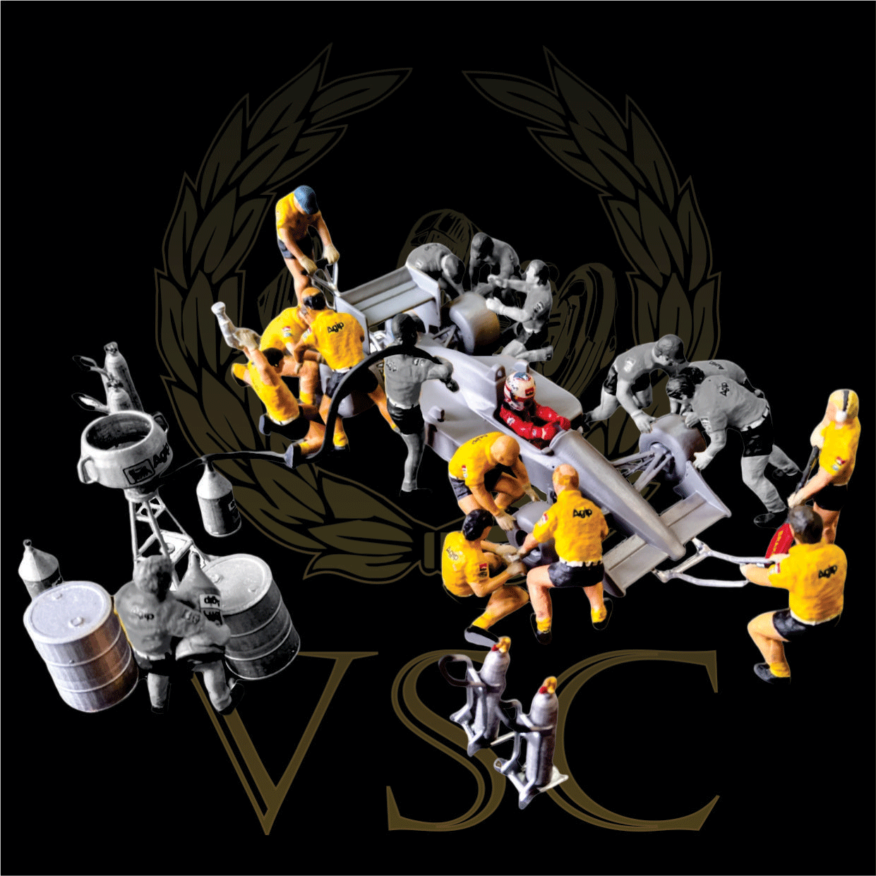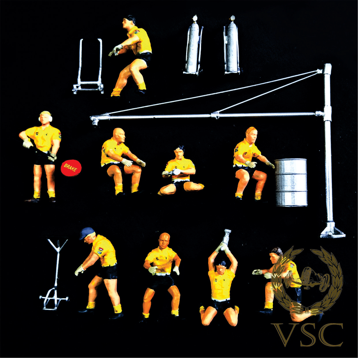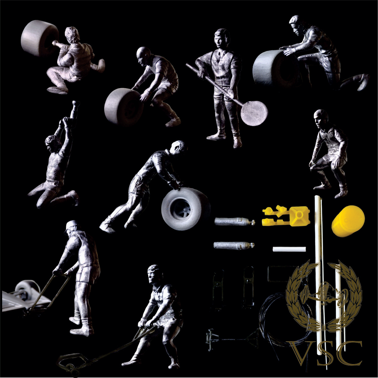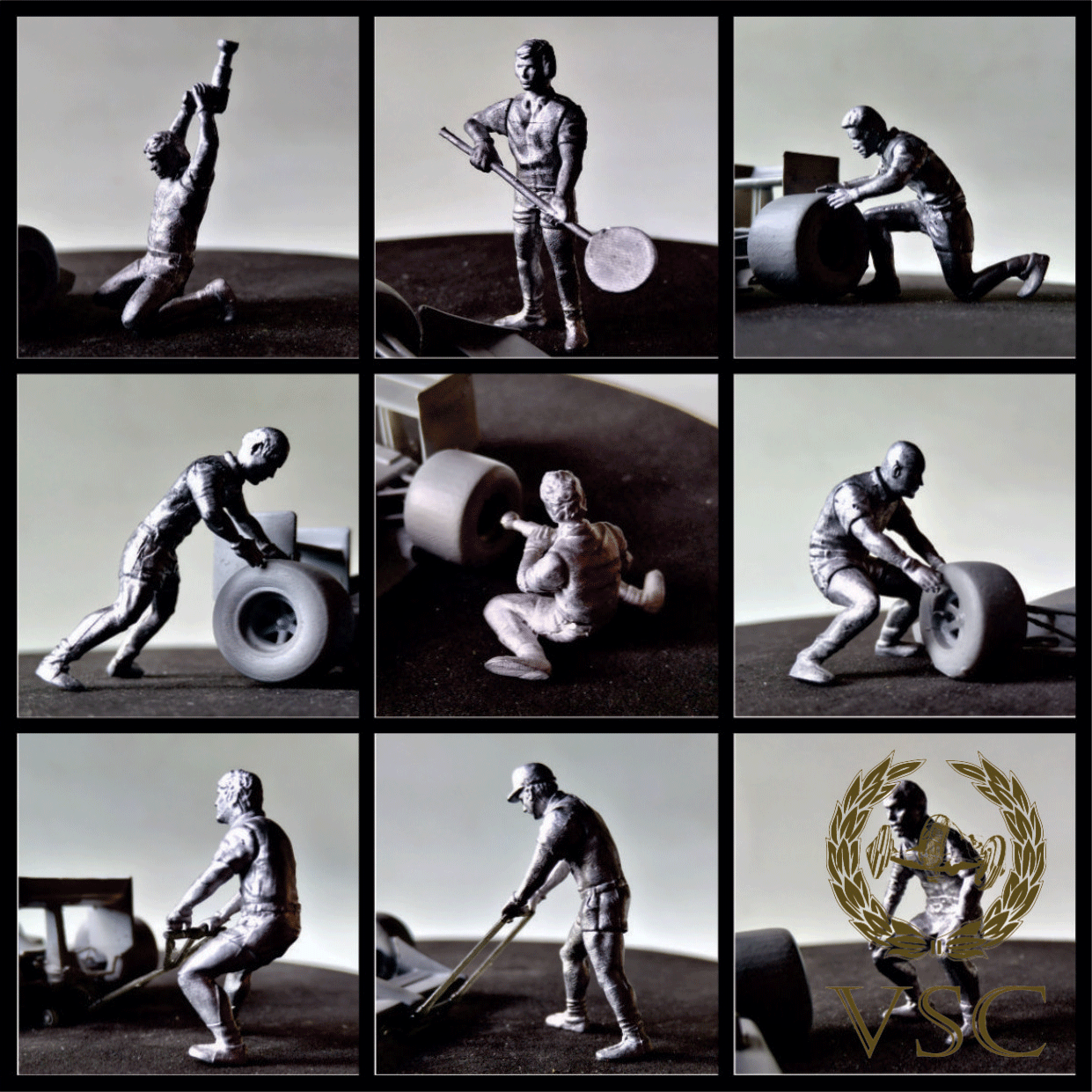 set de 9 figuras 1/43 ( + accesorios ) realizada en zamack, sin pintar ni decorar que, combinados con el set VSC-15-43-PIT-KIT2 conforman el set de pitbox de los años 80´s.-