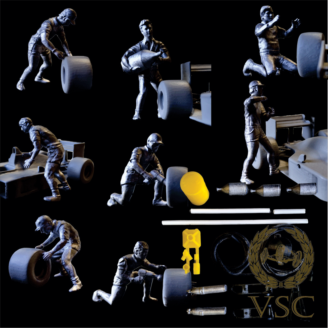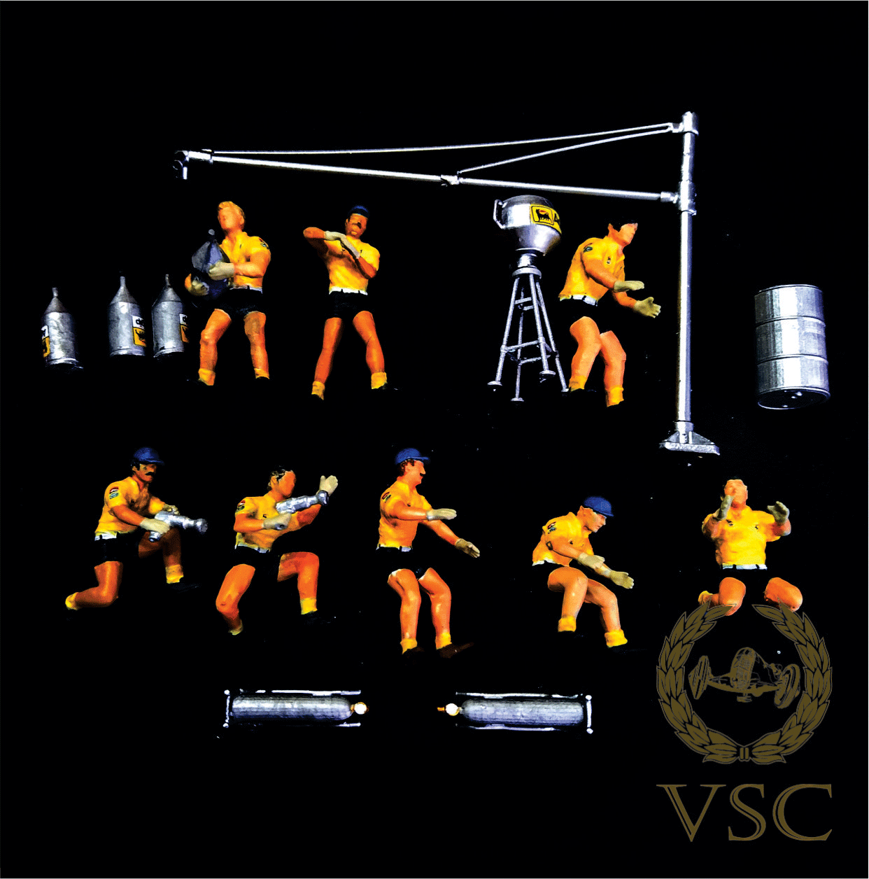set de 8 figuras 1/43 ( + accesorios ) realizada en zamack, sin pintar ni decorar que, combinados con el set VSC-15-43-PIT-KIT2 conforman el set de pitbox de los años 80´s.-