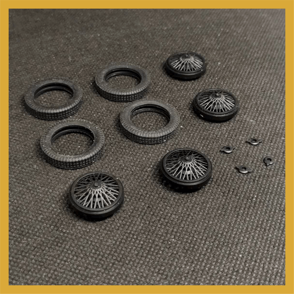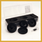Set compuesto por 4 cubiertas DUNLOP RACING + 4 llantas inyectadas en PP. de alambre. Logo en sobre relieve en ambas caras . Adaptable a coches de años 20 y 30 -Diám ruedas montadas: 24,5 mm tras. Eje 2 mm- adaptable a 3/32 /