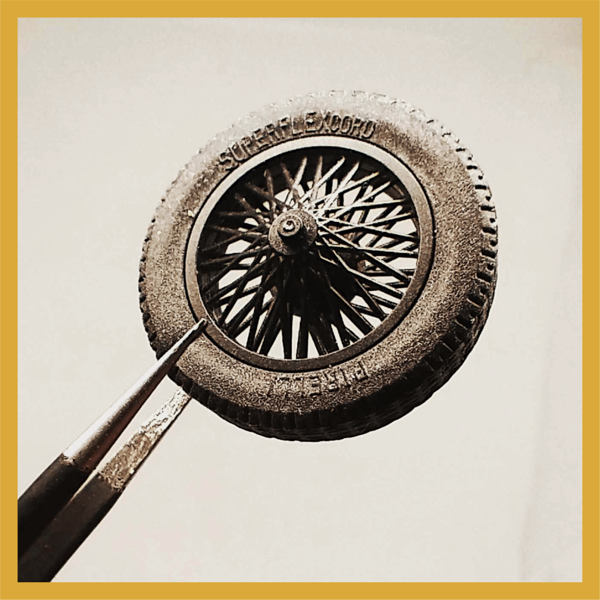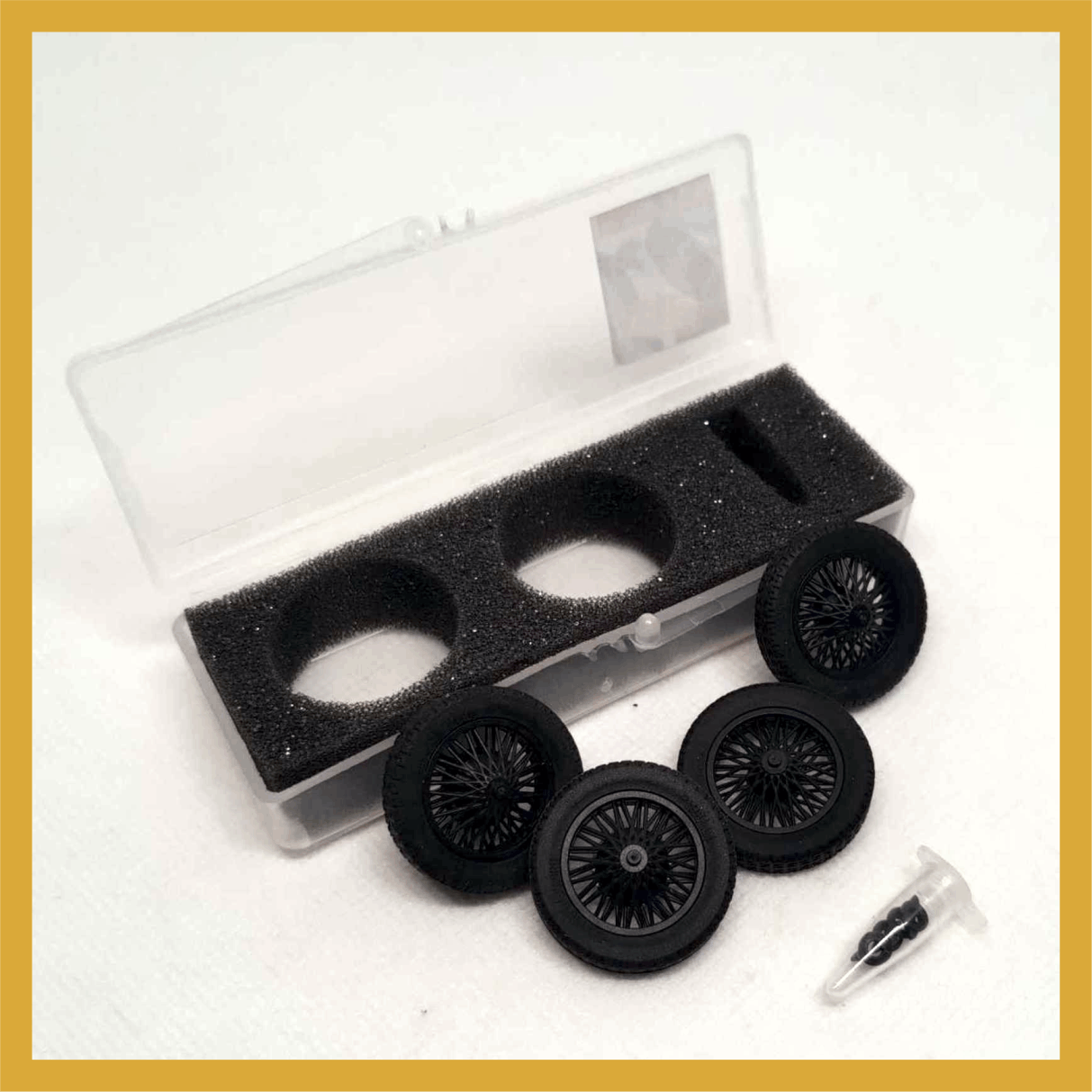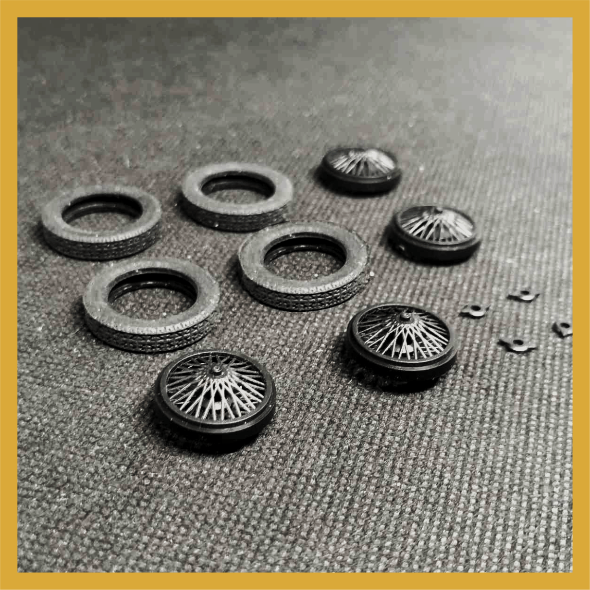 Set compuesto por 4 cubiertas PIRELLI SUPERFLEX CORD + 4 llantas inyectadas en PP. de alambre. Logo en sobre relieve en ambas caras . Adaptable a coches de años 30 al 60  -Diám ruedas montadas: 24,5 mm tras. Eje 2 mm- adaptable a 3/32 /