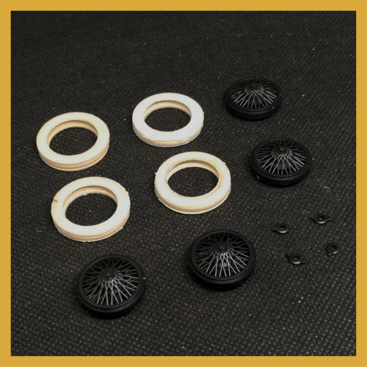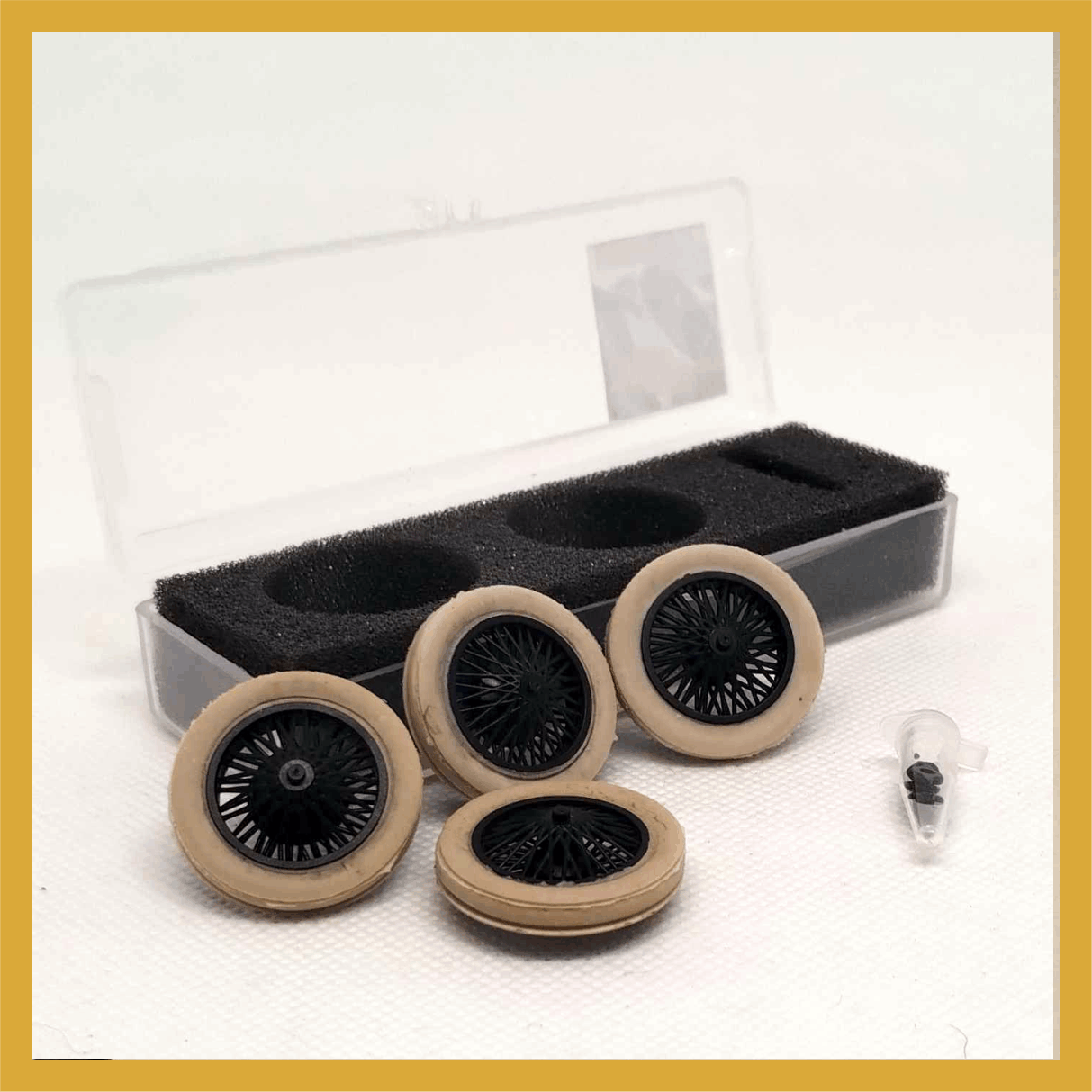 Set compuesto por 4 cubiertas ( tipo Firestone Ballon – Gum Dipped -Pirelli – Goodrich Silvertown Cord y otras ) + 4 llantas de alambre inyectadas en PP. Adaptable a coches de años 20 y 30 -Diám ruedas montadas: 22,7 mm tras.Eje 2 mm- adaptable a 3/32 /