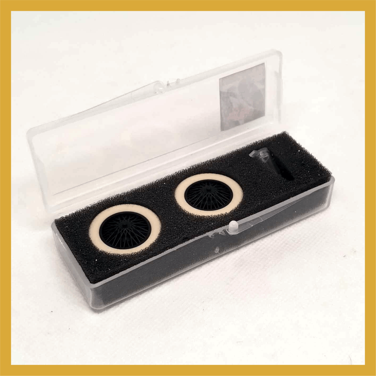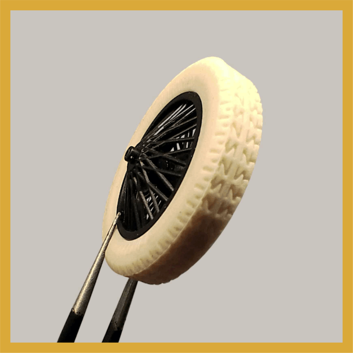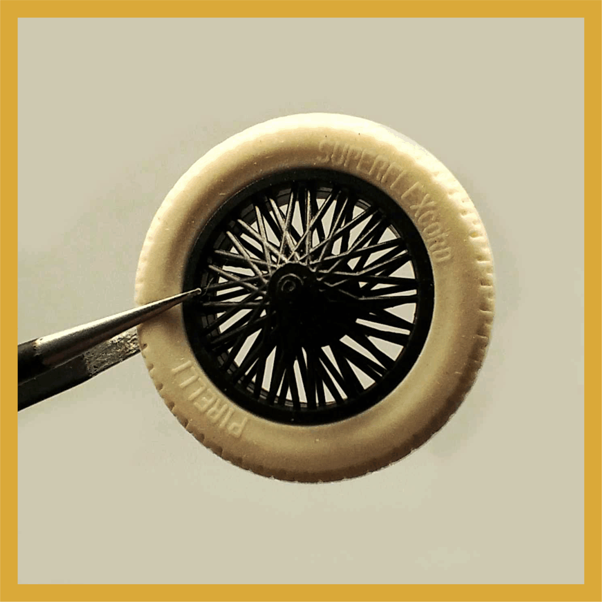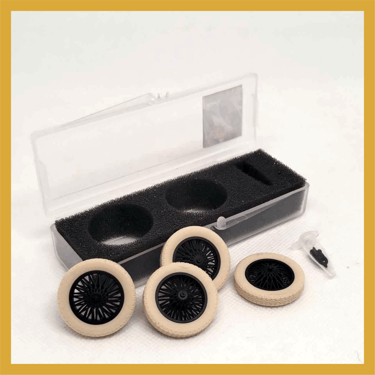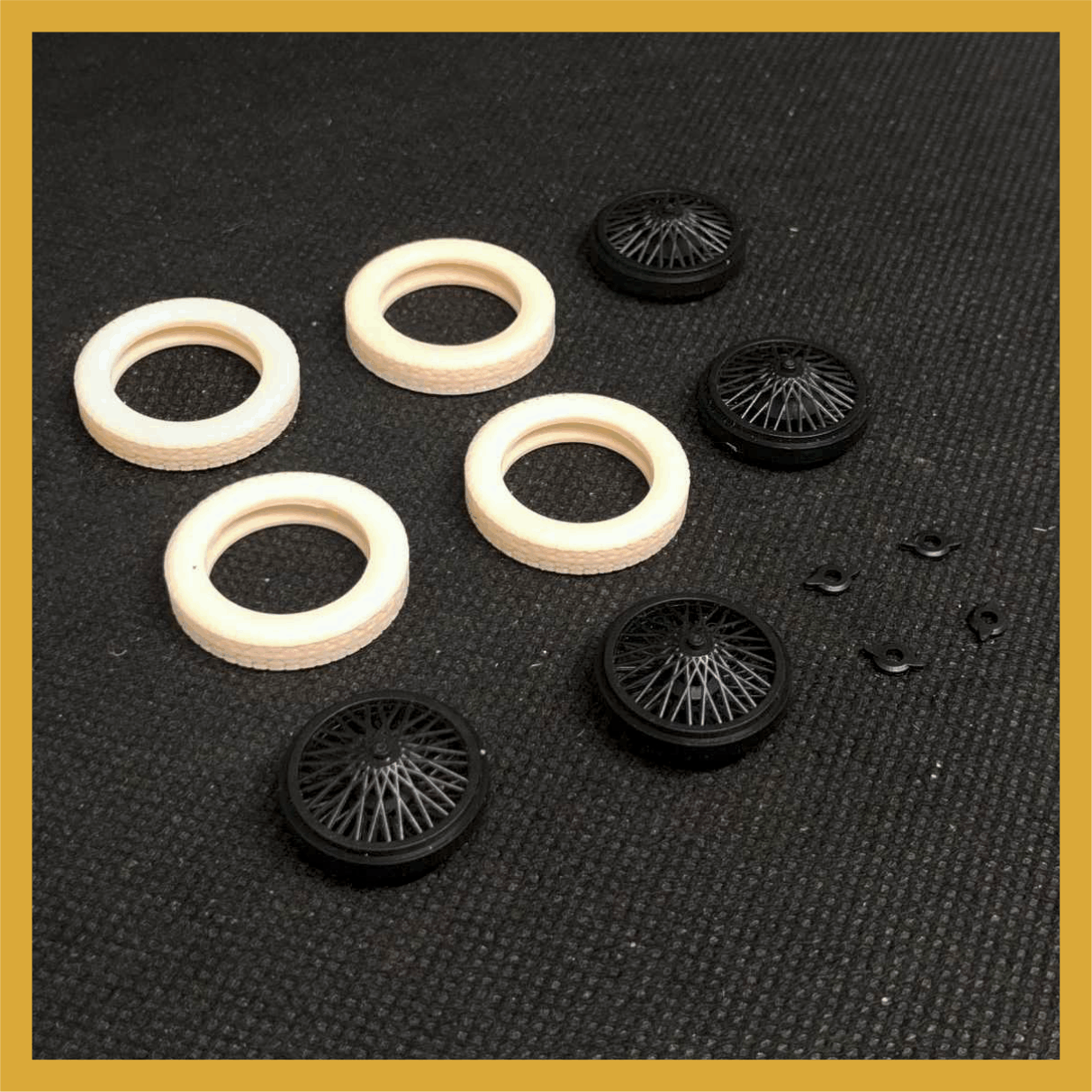 Set compuesto por 4 cubiertas PIRELLI SUPERFLEX CORD + 4 llantas inyectadas en PP. de alambre. Logo en sobre relieve en ambas caras . Adaptable a coches de años 30 al 50 -Diám ruedas montadas: 24,5 mm tras. Eje 2 mm- adaptable a 3/32 /